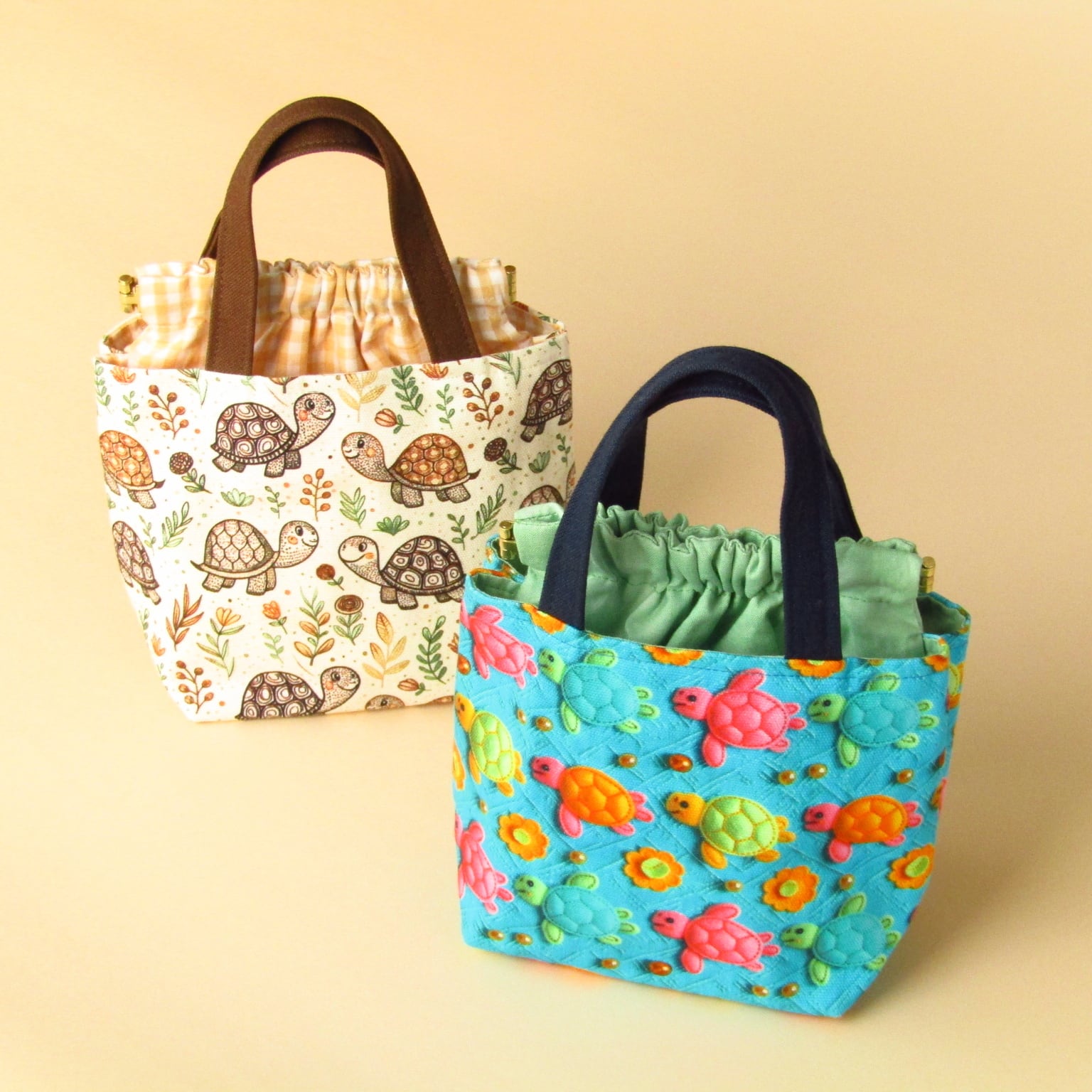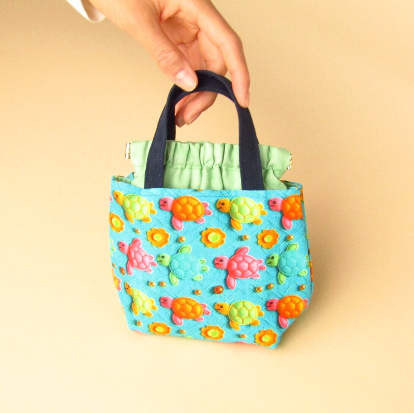 ぷっくりとしたフォルムが愛らしい鮮やかな亀さんのフォトファブリックを使った、手のひらサイズのトートバッグです。